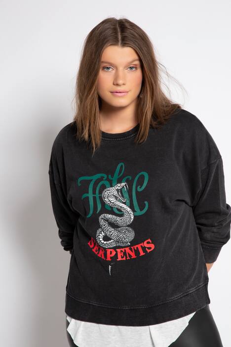 Bluza w modnym wytrawianym kolorze. Duży nadruk Serpents z motywem węża. Oversizowy fason z okrągłym dekoltem, naddanymi ramionami i długimi rękawami.