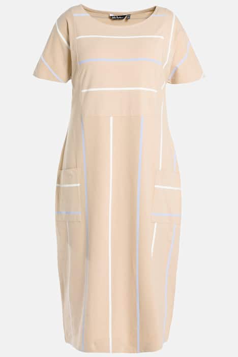 Sukienka w kolorowe paski. Oversizowy, prosty model z dżerseju, z okrągłym dekoltem, naddanymi ramionami i krótkim rękawem. Dwie naszyte kieszenie.