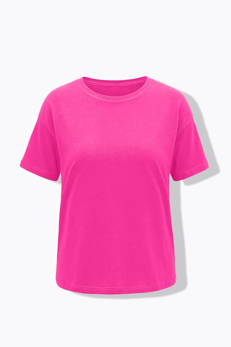 T-shirt Basic o szerokim, relaksowym kroju, bardzo wygodny. Okrągły dekolt, naddane opadające ramiona i krótkie rękawki.