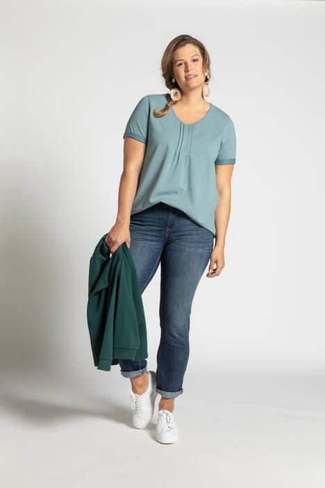 T-shirt z bio-bawełny. Drobne kropeczki. Dekolt w szpic, zakładki, krótkie rękawy.