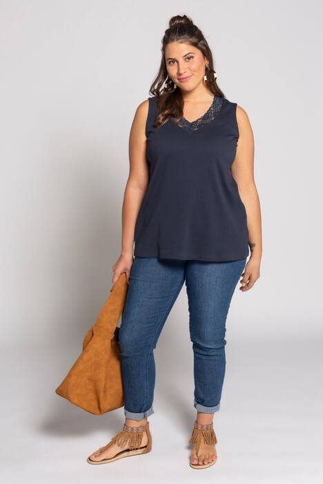 Top, dekolt w szpic, koronka, prążkowany materiał